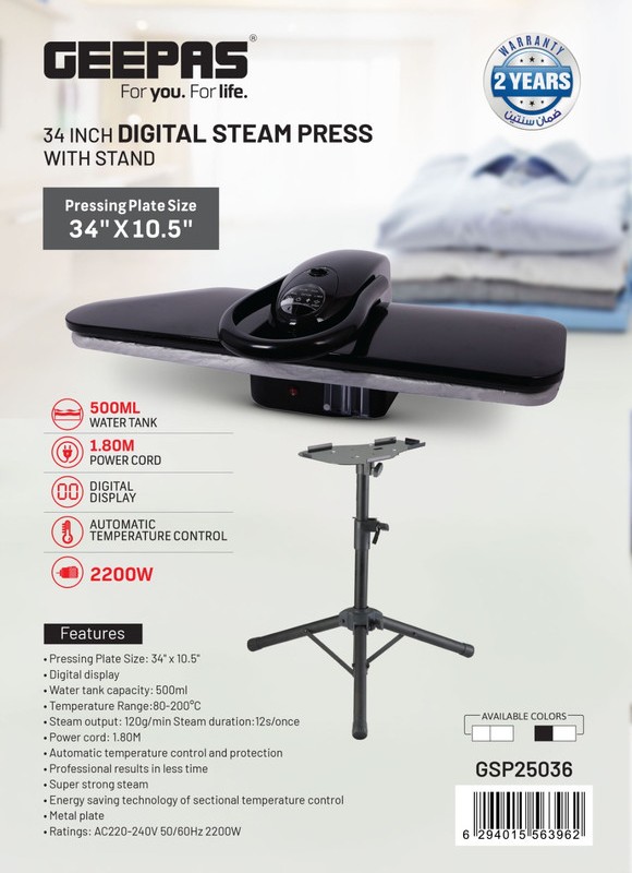 اتو پرس دیجیتال جیپاس مدل GSP25036 یک دستگاه پیشرفته و کاربردی برای افرادی است که به دنبال اتوکشی راحت، سریع و حرفه ای هستند. این پرس با صفحه ای بزرگ و بخار قدرتمند، لباس ها را با کیفیت مطلوب و بدون دردسر صاف می کند.