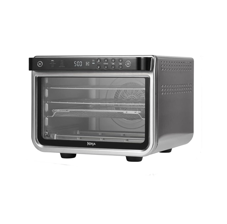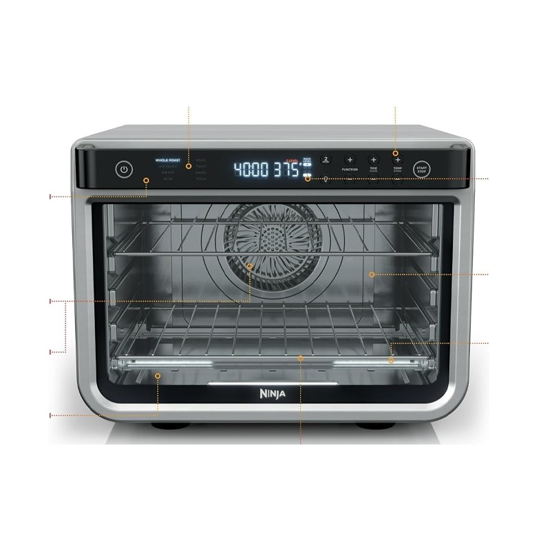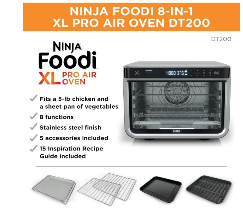 فر برقی نینجا مدل DT200 از نوع فر برقی رومیزی شرکت نینجا با توان مصرفی 2400 وات و با ظرفیت 29 لیتر می باشد رنگ بندی فر برقی نینجا مدل DT200 مشکی و استیل می باشد مخزن فر برقی نینجا مدل DT200 شامل یک سبد سرخ کردنی باظرفیت 1.8 کیلوگرم، یک قفسه پیتزای 12 اینچی، با یک قفسه کباب با ظرفیت یک بوقلمون 5.5 کیلوگرمی می باشد .