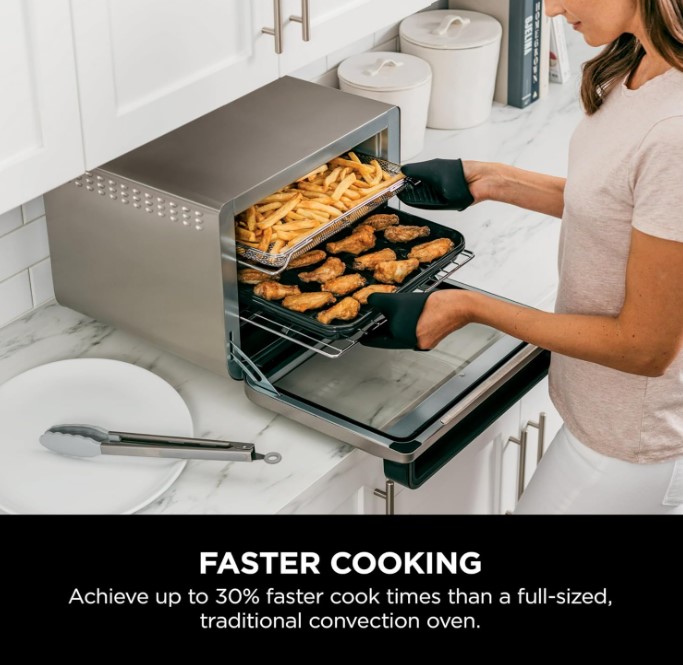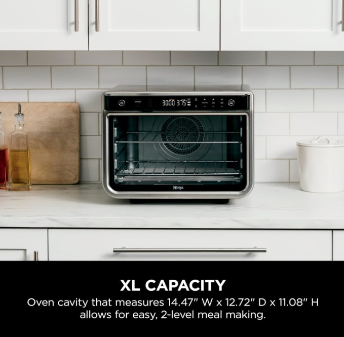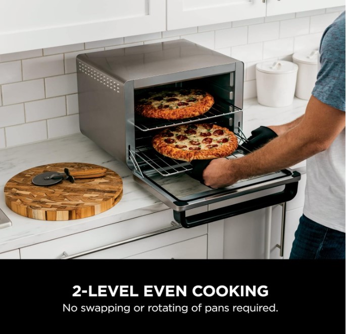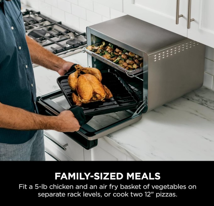 اجاق گاز همراه با 2 قفسه سیمی (هر یک با پیتزای 12 اینچی)، یک سینی فر، سینی برشته و یک سبد سرخ کردنی هوا (با گنجایش حداکثر 1.8 کیلوگرم مواد) همراه است.