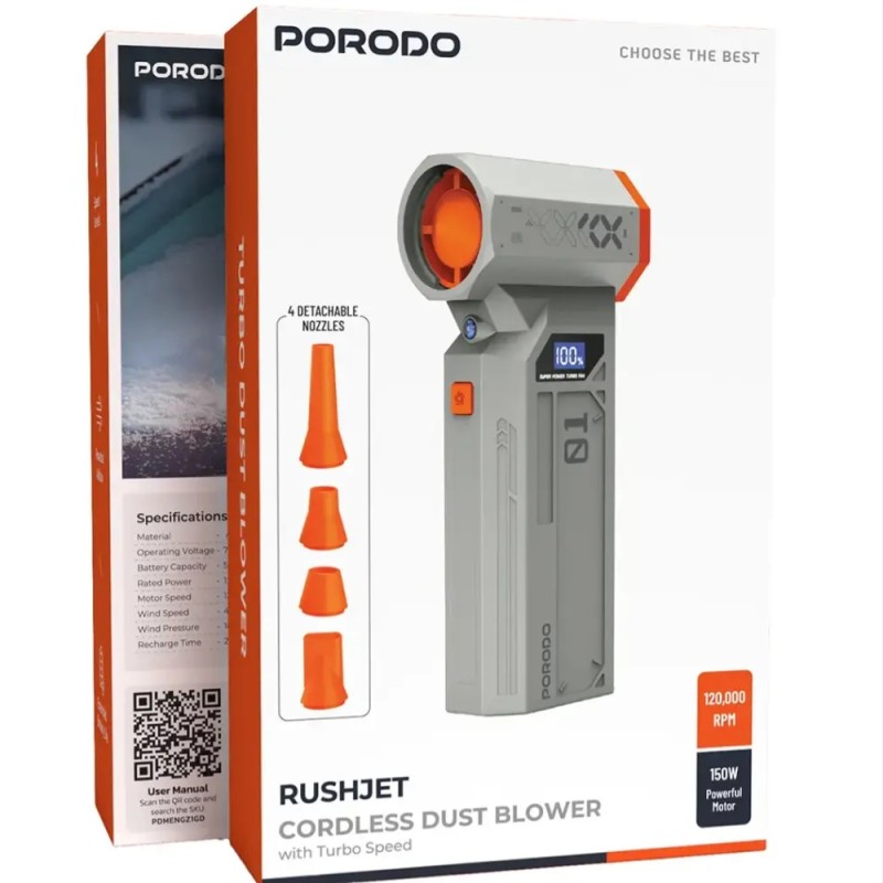 گردگیر بی‌سیم Porodo RUSHJET با موتور قدرتمندی که قادر به چرخش ۱۲۰۰۰۰ دور در دقیقه و مصرف تنها ۱۵۰ وات است، ابزاری ایده‌آل برای جمع‌آوری کارآمد گرد و غبار در کمترین زمان ممکن است. این دمنده بی‌سیم جمع و جور اما قدرتمند دارای چهار نازل قابل تعویض است که بسته به نوع سطح تمیز شونده، می‌توانند متصل یا جدا شوند. گزینه سرعت توربو جریان هوا را به حداکثر می‌رساند و کارهای شما را سریع‌تر از همیشه می‌کند. چه در حال تمیز کردن لوازم الکترونیکی، ماشین خود یا مکان‌های صعب‌العبور باشید، RUSHJET به لطف عمر باتری طولانی و پورت شارژ USB-C مناسب، همه چیز را آسان می‌کند. این دستگاه دارای گزینه‌های سرعت مختلف برای رفع نیازهای نظافتی شما است: برای کارهای سبک، دنده ۱ ایده‌آل است؛ برای کارهای متوسط، دنده‌های ۲ و ۳؛ و برای کارهای سنگین، دنده توربو حداکثر عملکرد را ارائه می‌دهد. RUSHJET نه تنها قدرتمند، بلکه از نظر کارکرد نیز مقرون به صرفه است، زمان از کار افتادگی را به حداقل می‌رساند و نتایج طولانی مدتی را ارائه می‌دهد. این دستگاه برای استفاده در خانه، دفتر و ماشین مناسب است و آن را به یک شریک قابل اعتماد در مبارزه با محیط‌های پر گرد و غبار تبدیل می‌کند.