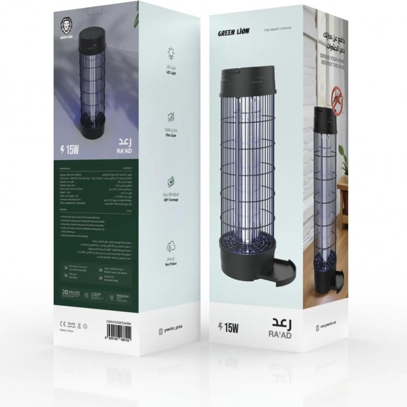 لامپهای UVA 15 واتی کشنده حشرات سبز Lion RAAD، سبک وزن و قابل حمل، پوشش 360 درجه، غیر سمی، 50 متر مربع منطقه تحت پوشش، طول عمر 5000 تا 8000 ساعت، طول سیم برق 1 متر – مشکی